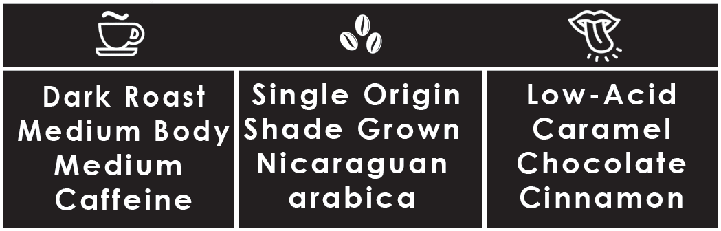 About the Beans: 100% arabica, direct trade, single origin beans grown at a high elevation (approx 4,000 ft) in Nicaragua. The richly aromatic, full-bodied, Italian Roast is perfect for this flavorful blend. Naturally processed. Medium caffeine level.